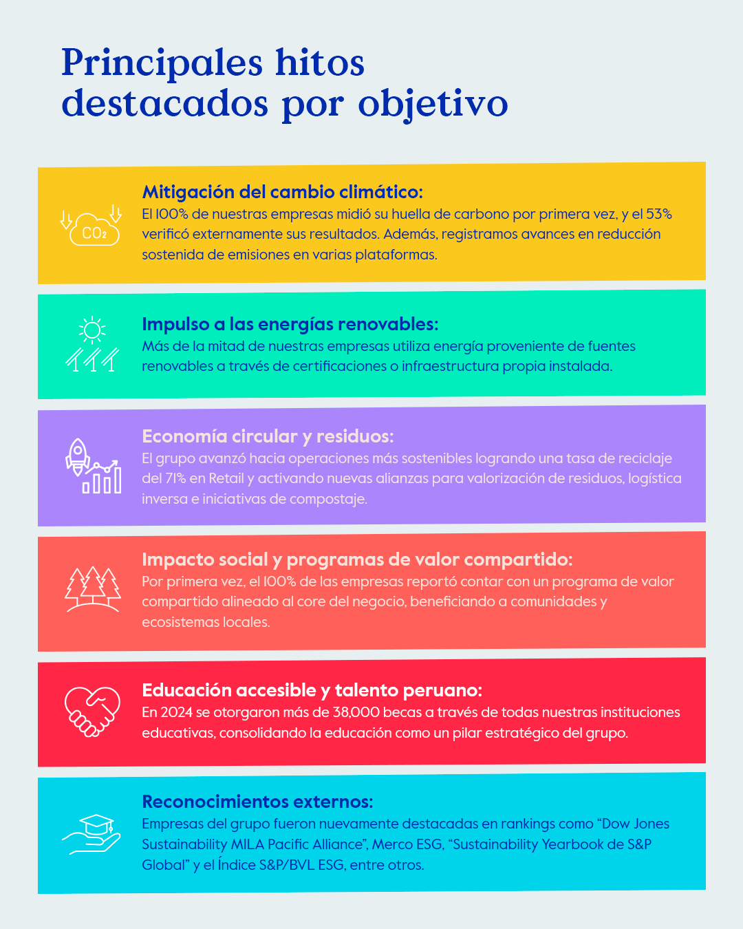 - El 2024 marcó un año clave para continuar fortaleciendo nuestra estrategia y gestión de sostenibilidad. Por tercer año consecutivo, todas nuestras empresas reportaron sus iniciativas y resultados de manera alineada a los seis objetivos estratégicos de sostenibilidad del grupo, ahora con metas definidas hacia el 2030.
